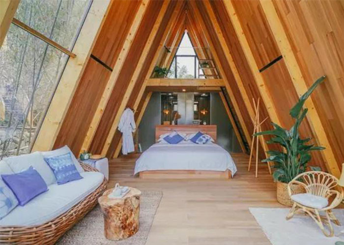 Αυτό το τρίγωνο ξύλινο σπίτι έχει ένα μοναδικό τρίγωνο σχήμα. Το γυάλινο παράθυρο του δαπέδου κάνει όλο το δωμάτιο φωτεινό και καλά φωτισμένο. Τα τραπέζια και οι καρέκλες τοποθετούνται στο ανοιχτό κατάστρωμα,που είναι κατάλληλο για να καθίσει εκεί μετά το δείπνοΈχει κουζίνα, μπάνιο, κρεβατοκάμαρα και σαλόνι.το οποίο είναι πιο κατάλληλο για ξενοδοχειακά και ξενοδοχειακά έργα στην τουριστική περιοχήΜπορεί επίσης να γίνει για ένα ιδιωτικό σπίτι.